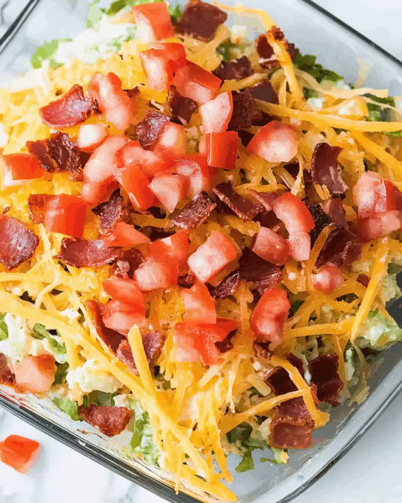 - Layer the Toppings: Add 2 cups finely chopped lettuce, followed by 1 cup diced tomatoes, and 8 slices cooked and chopped bacon.