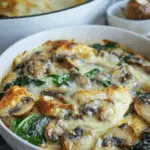 This chicken spinach and mushroom recipe is a creamy, comforting casserole with tender chicken, sautéed mushrooms, baby spinach, and gooey melted mozzarella. Perfect for weeknight dinners or entertaining guests, it’s hearty and easy to make.