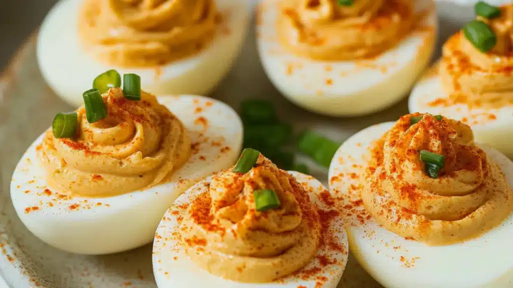 Deviled eggs, especially this spicy version, offer more than just great taste. They are naturally low in carbohydrates and high in protein, making them a perfect snack or appetizer for those on keto, paleo, or low-carb diets. Eggs provide essential nutrients like vitamin B12, vitamin D, choline, and selenium. The added spice can even boost metabolism slightly, while healthy fats from mayonnaise or avocado contribute to longer-lasting fullness. Compared to traditional fried or carb-heavy snacks, these deviled eggs offer a more nutrient-dense, waistline-friendly option.