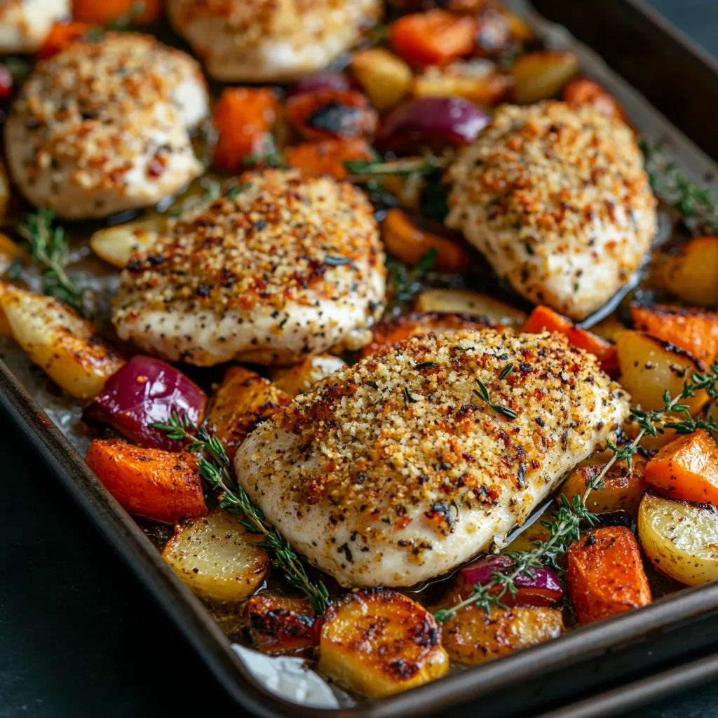 Transfer the sheet pan to the preheated oven. Bake for 25 to 30 minutes, or until the chicken reaches an internal temperature of 165°F (75°C). The crust should be golden brown and crispy, and the vegetables should be slightly caramelized on the edges.