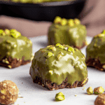 - Prepare Pistachio Coating: Chop pistachios and mix into pistachio cream. Microwave the cream for 5–10 seconds to soften. Dip each chilled brownie ball into the pistachio cream, letting excess drip off.